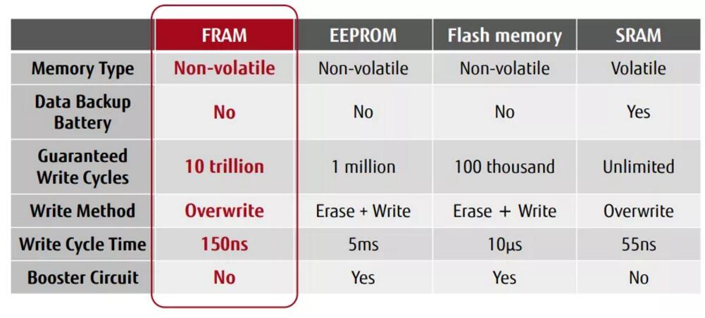 其中FRAM写入次数寿命高达10万亿次、而EEPROM仅有百万次(10^6)。同时,FRAM写入数据可在150ns内完成、速度约为EEPROM的1/30,000,写入一个字节数据的功耗仅为150nJ、约为EEPROM的1/400,在电池供电应用中具有无与伦比的优势。