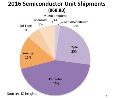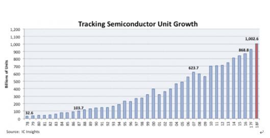 IC Insights透露,全球半导体(包括光电器件、集成电路、分立器件与传感器)出货量将持续稳定上升,并希望在2018年第一次达到年出货量超过1万亿颗的目标。