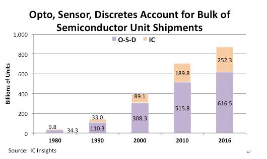 虽然集成电路技术不断发展,越来越多的功能被集成到一颗存储芯片中,从而以系统的角度来看用到的芯片数量越来越少,但IC Insights的统计结果显示,全球半导体出货量中,集成电路占比依然很低,而光电器件、传感器与分立器件(Opto-Sensor-Discrete,简称O-S-D)的比重仍然超过七成。