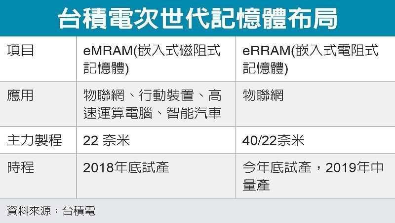 台积电技术长孙元成近日在台积电技术论坛上,第一次披露台积电研发多年的eMRAM(嵌入式磁阻式随机存取内存)和eRRAM(嵌入式电阻式内存),分别定于明后年实行风险性试产,主要使用22mn制程,这将是台积电因应高速运算计算机、物联网、行动装置和智能汽车等四领域所供给效能更迅速和耗电更低的新内存。