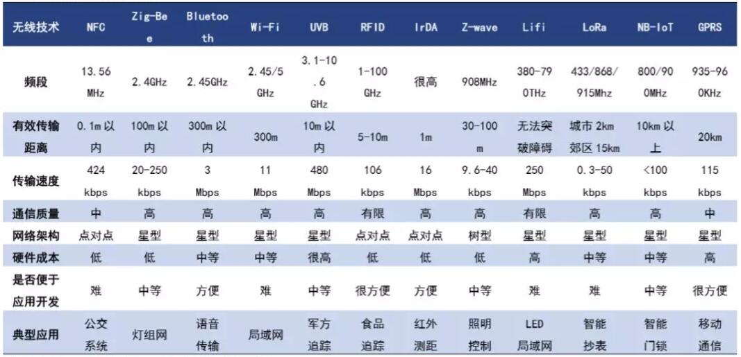 无线通信技术主要分广域网和局域网两种,具体差别在传输距离和通信协议方面。局域网无线通信技术包括、WIFI、蓝牙、ZigBee、UWB、RFID、LiFi等,传输一般在0-300米;广域网无线通信技术包括GPRS、LoRa、NB-IoT等,有效传输距离在公里级。蓝牙是最主要的局域网(短距离)无线通信方式之一,适合覆盖距离在百米以内、数据传输量较小的通信。