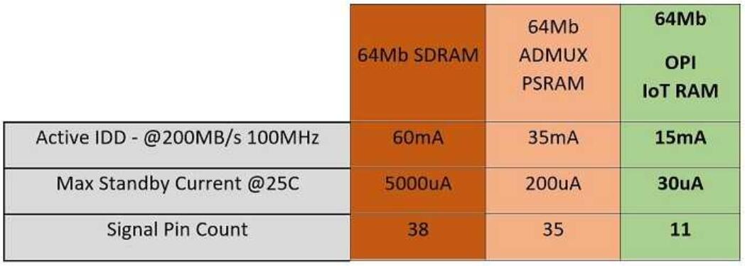 ram替换DRAM,消除了对外部刷新控制器的需求,这降低了接口的复杂性和相关的验证成本,利用了外部SPI接口的使用,同时保持了最新IoT应用程序所要求的高性能水平,并降低整个系统的功耗。有些基于MCU的旧系统仍在使用SDRAM,在降低功耗和简化接口方面,可以受益于IoT RAM的使用。下表清楚显示了待机电流和有功电流的优点,同时保持了相当的传输速率。