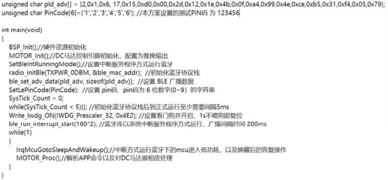 以下为主函数初始化配置内容,主要将所有的外设资源和蓝牙协议栈初始化,并且以中断服务程序的方式运行蓝牙,主函数的循环中主要实现的功能为判断是否进入低功耗模式,并且唤醒后根据接收到的蓝牙数据对DC马达进行不同的操作,代码如下: