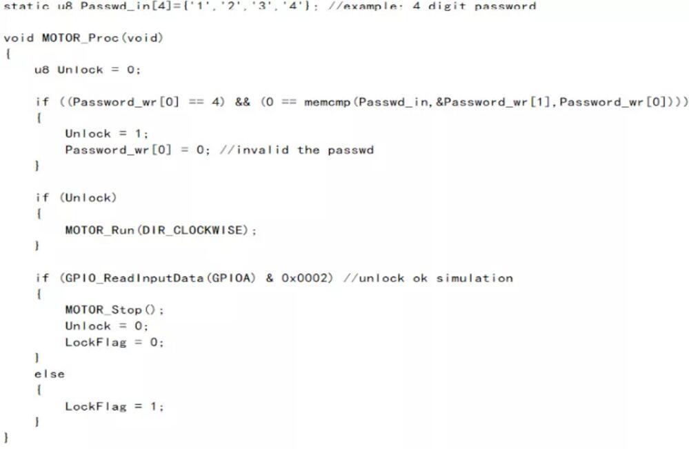 在MOTOR_Proc()处理函数中针对蓝牙接收到的密码数据进行解析,如果与默认设置的4位0-9数字密码完全匹配上则操作解锁,将DC马达按照设定方向控制运转,为了简易验证,模拟一个信号表示解锁成功,这里是通过采集指定IO引脚PA1的输入来实现,采集到输入为高电平那么停止DC马达转动,且清零锁定标志位。以下为代码实现内容: