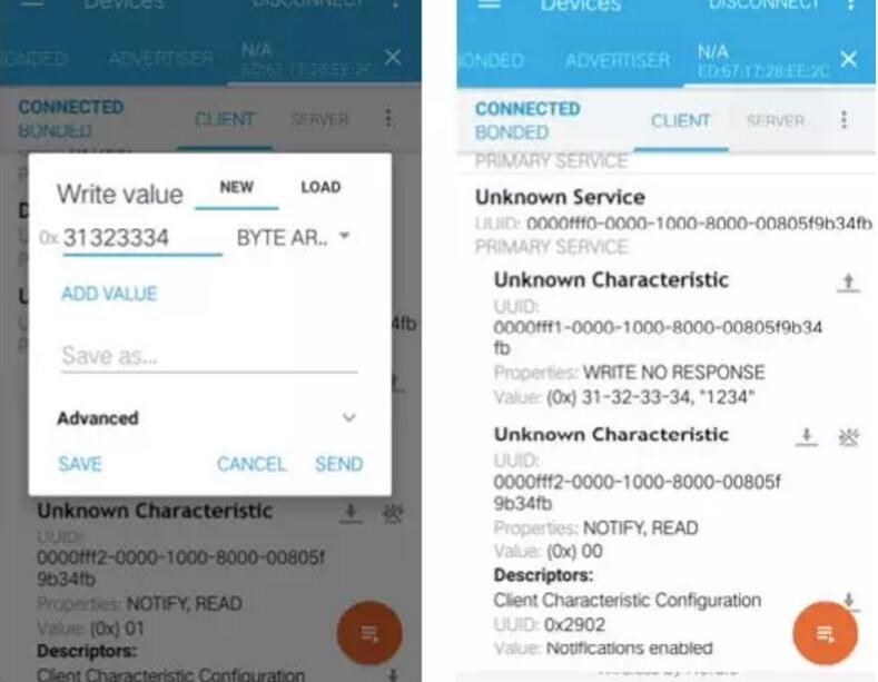 连接成功后,对UUID为fff1的特征值写0x31323334(模拟用户输入密码”1234”),测试板上连接的马达开始转动,执行开锁动作;