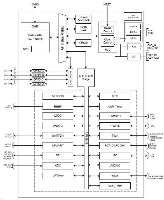 - 32 位ARM®Cortex-M0+处理器内核,最高工作频率可达24MHz