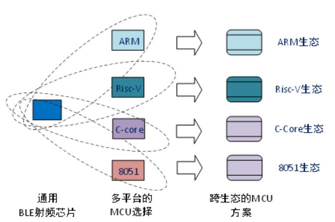 这样,通过将通用ble射频芯片和多样化的微控制器芯片相结合,制造商可以快速组合多样化和灵活的BLE单芯片或模块化解决方案,以满足不同的生态需求和市场需求。