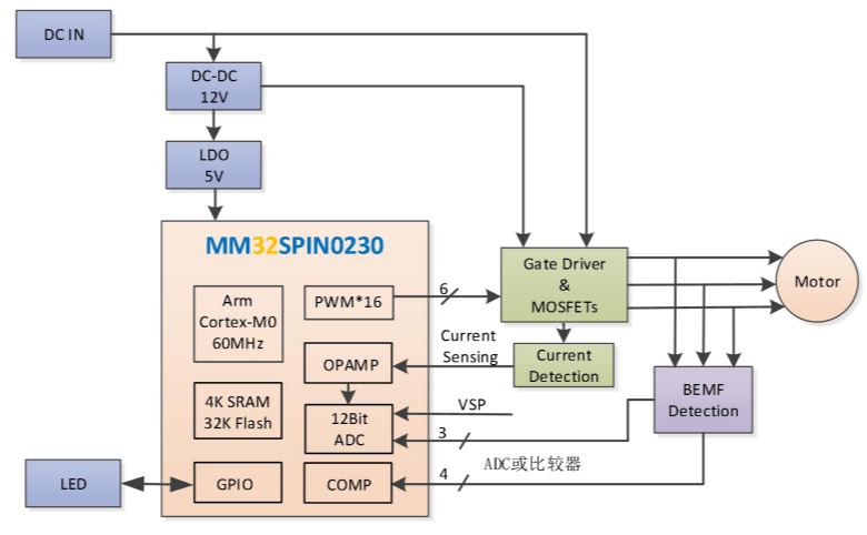 下图是MM32SPIN0230无感方波方案硬件框图。