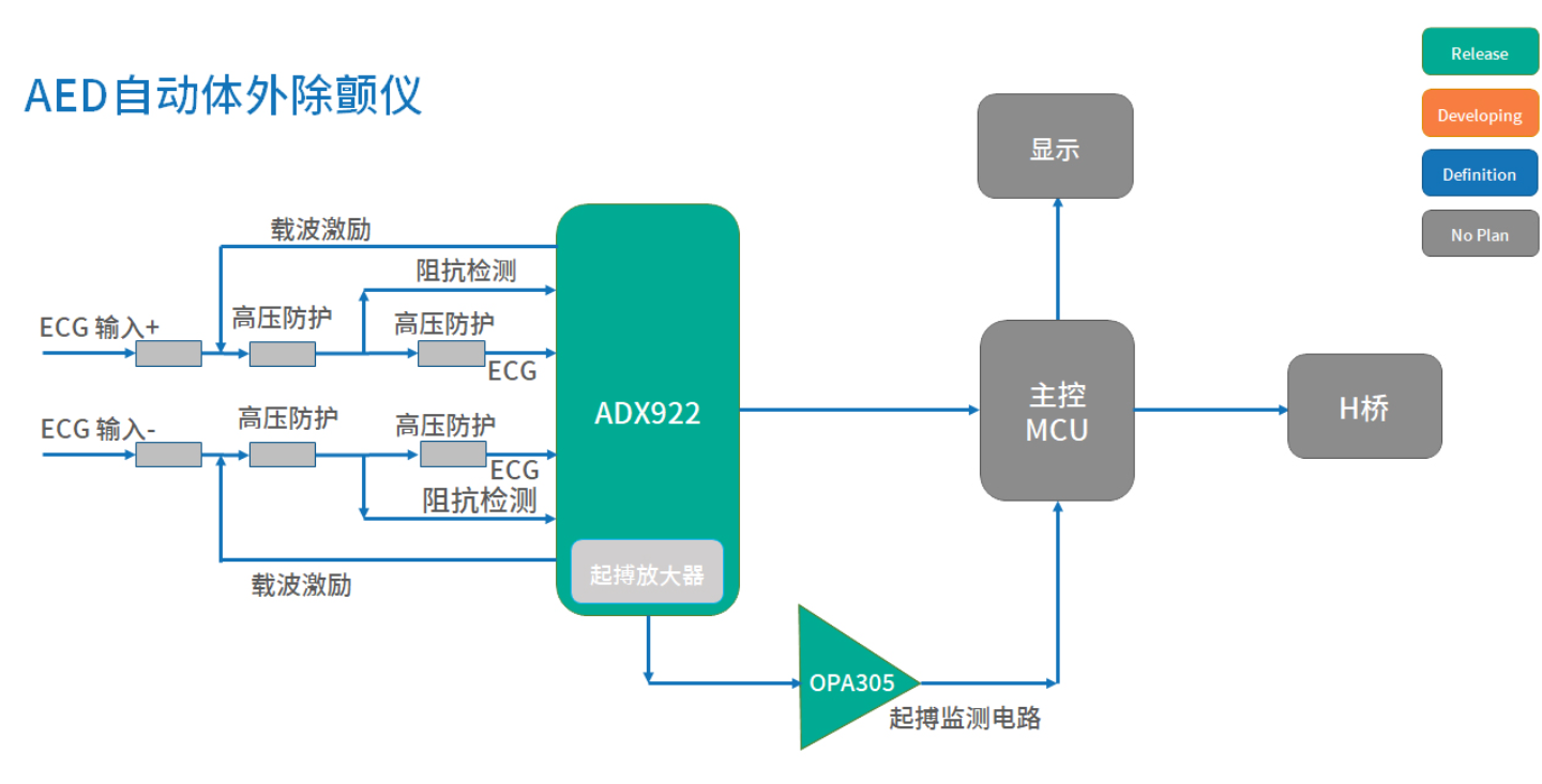 自动体外除颤器(AED)是心脏骤停急救中快速对患者心脏实施电击来达到除颤,可以帮助普通人快速实施除颤。类比的ECG模拟前端可以快速准确地监控患者的心脏状态,来实施准确高效的除颤效果。