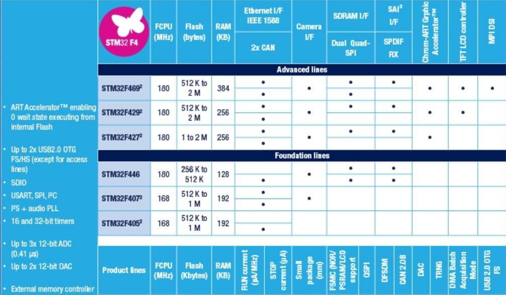 STM32F407/417–168MHzCPU/210DMIPS,高达1MB的闪存,添加了以太网MAC和摄像头接口