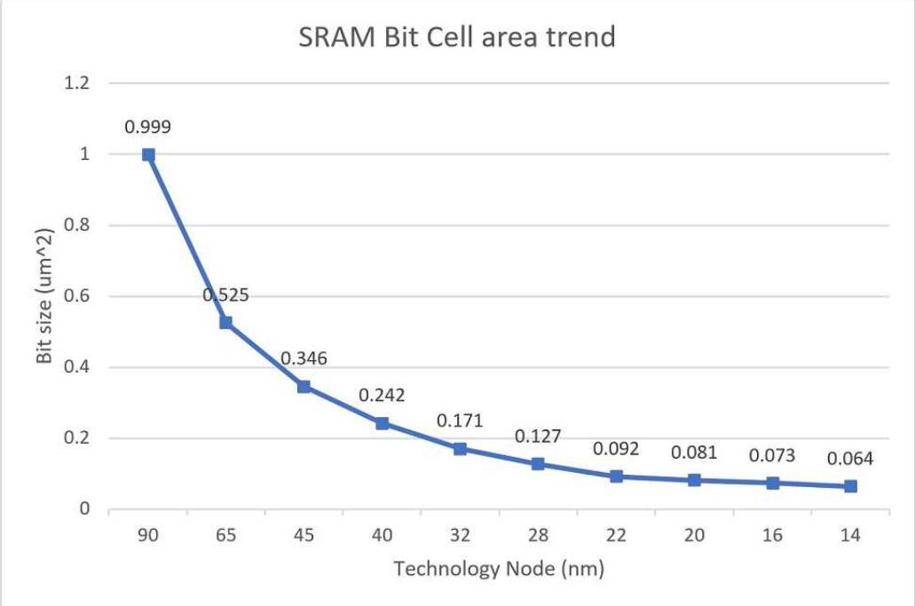 图2位单元趋势显示随着过程节点缩小,缩放比例逐渐减小。