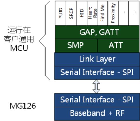 MG126使用独创的创新架构设计,采用常见的SPI通信接口,芯片本身不需要额外的唤醒信号已节省MCU IO资源。前端芯片包含RF和BLE数字基带,完成BLE广播和数据的接收/发送和调制/解调以及基带数据转换。BLE协议栈运行在MCU上,复用MCU强大的处理和控制能力,提高了MCU的资源利用率。该芯片采用QFN16封装,体积只有3mmX3mm。
